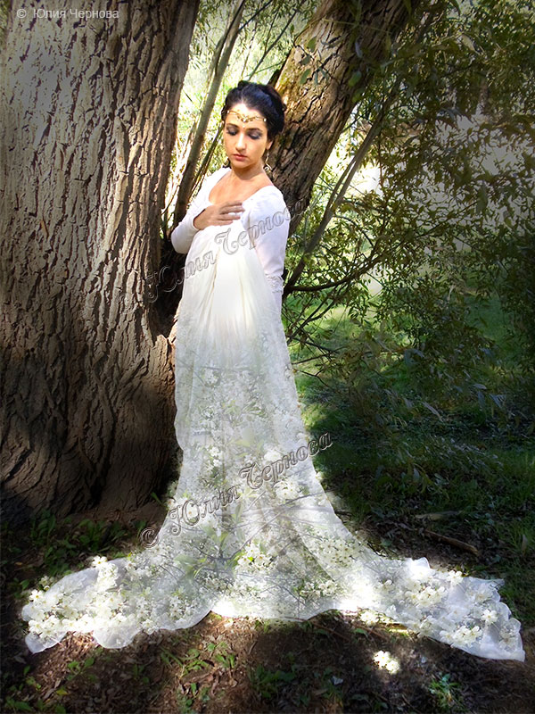 Проведена съемка модели на природе (певица Елена Х.). Сделана ретушь и художественная обработка в японском стиле. В результате платье в буквальном смысле соткано из цветов вишни.